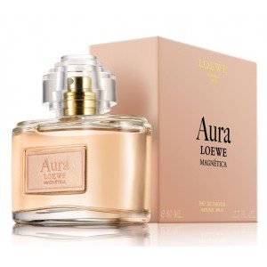 Aura Loewe Magnética de Loewe es una fragancia de la familia olfativa Almizcle Floral Amaderado para Mujeres. Aura Loewe Magnética se lanzó en 2013. Las Notas de Salida son pimienta rosa, bergamota y mandarina; las Notas de Corazón son aceite de rosas y jazmín sambac (sampaguita); las Notas de Fondo son cuero , sándalo australiano, pachulí, benjuí de Siam, vainilla Bourbon y almizcle.